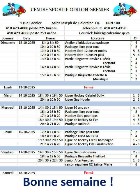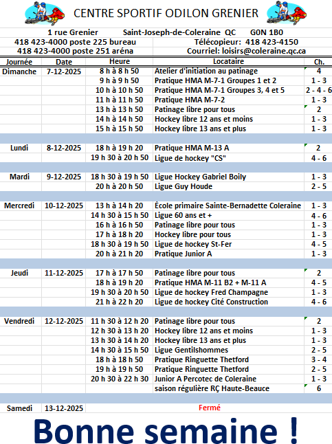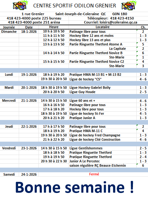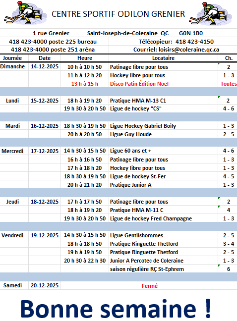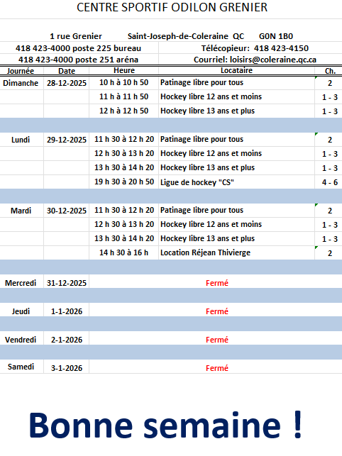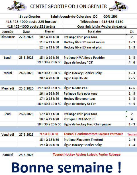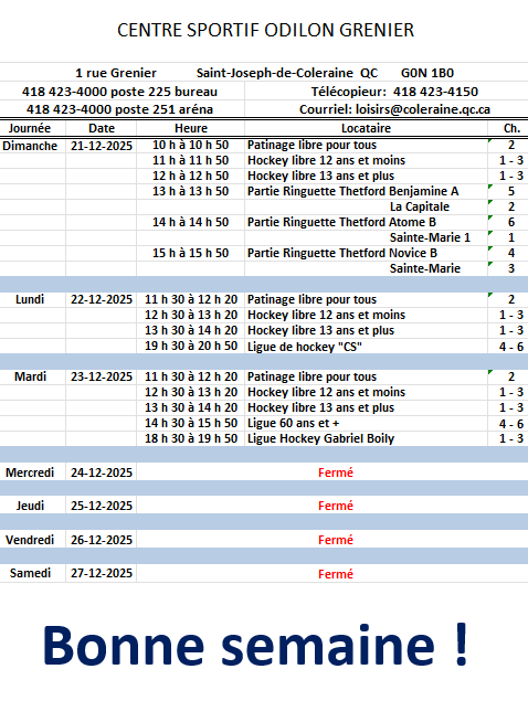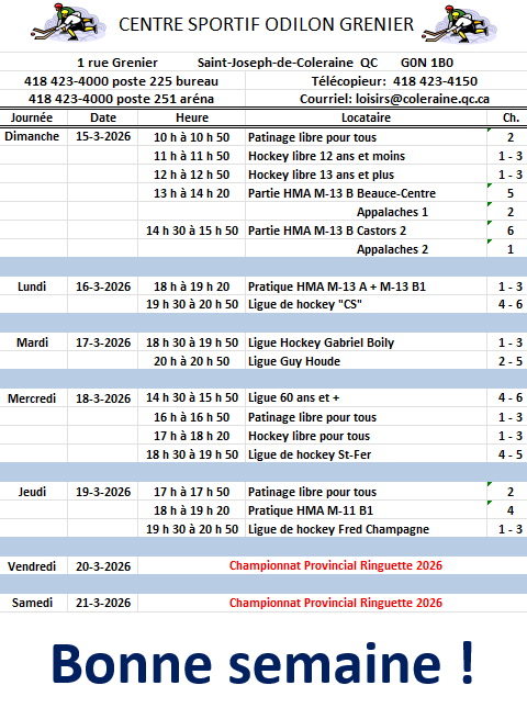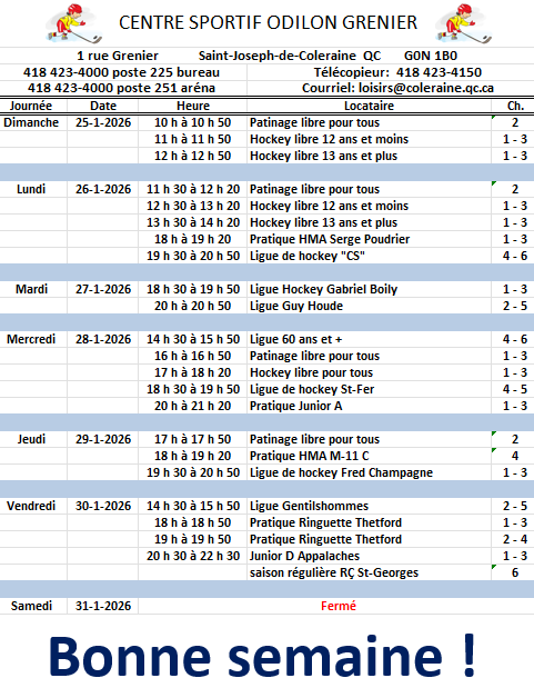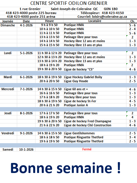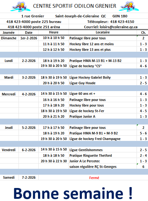 Horaire hebdomadaire des locations de glace