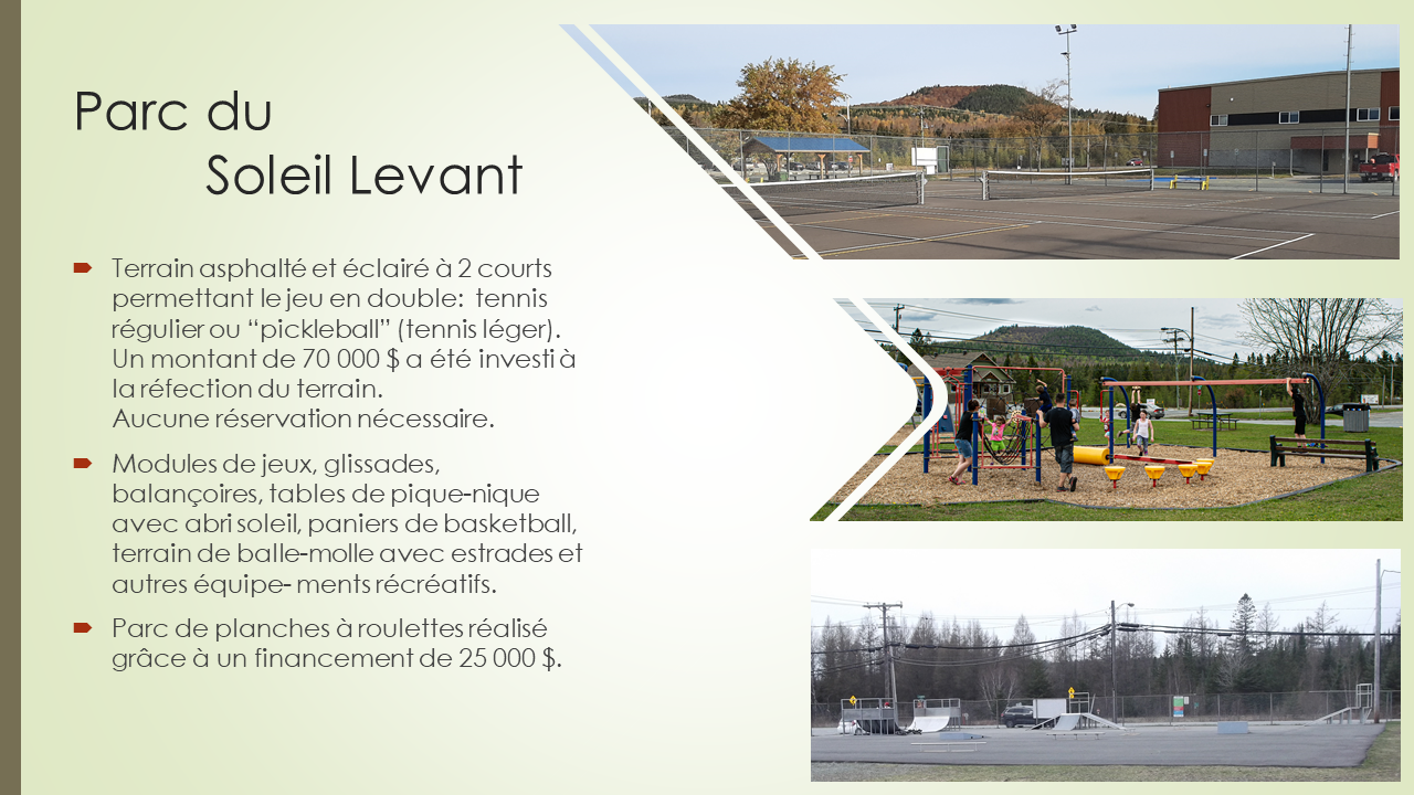 Haltes de fraîcheur et de plein-air, espaces de jeux et de relaxation, terrains de sports diversifiés, les espaces verts jouent de grands rôles au coeur de la collectivité en permettant aux jeunes de tous les âges de socialiser, de s'amuser et de profiter de la vie à l'extérieur.